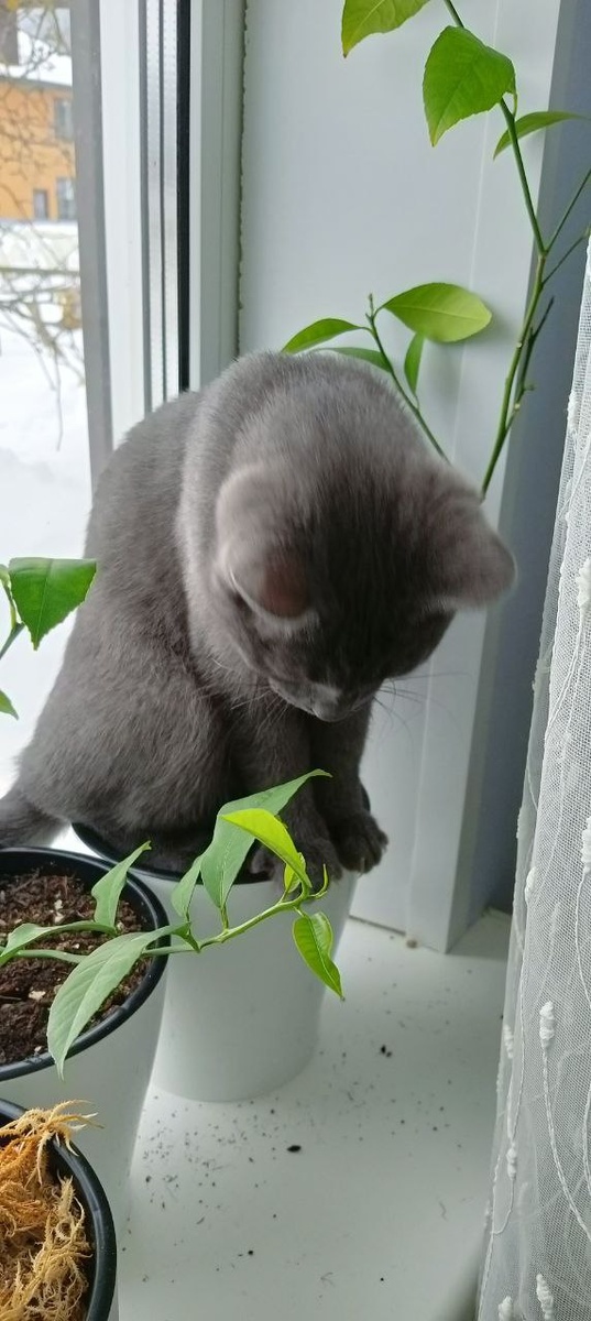Сегодня я поливала цветы на подоконнике и заметила такую картину: Гриша сидел в горшке с лимоном