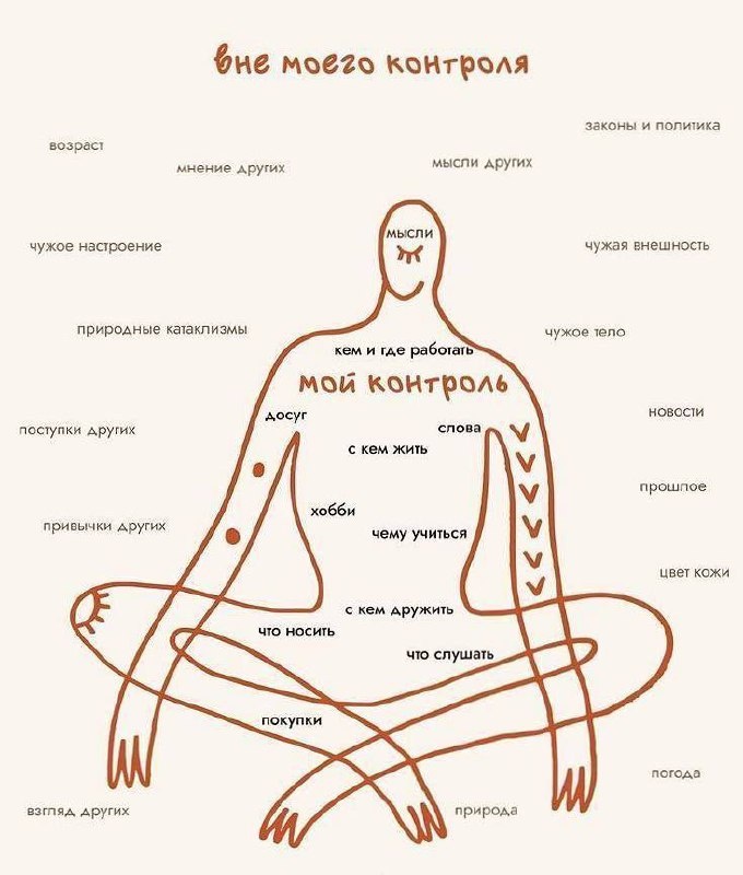 Плохая: вы не можете контролировать почти ничего. Хорошая: вам и не надо. Вечный источник тревоги — мы пытаемся управлять тем, что от нас не зависит. Давайте просто и жёстко разделим. Это моё: — Мои мысли и реакции — Мои поступки и слова — Мой выбор (что ем, с кем сплю, куда иду) — Моя забота о себе — Моё состояние и намерения Это не моё, хоть убей: — Что думают другие — Настроение мужа/мамы/начальника — Когда встречу «того самого» — Повысят ли зарплату — Здоровье близких (мы не боги) — Планеты, карма и сроки вселенной Тревога = когда ты дёргаешь шнурок от утюга, надеясь включить чайник. Не работает. И психология, и эзотерика тут об одном: ты отвечаешь за своё состояние, но не за обстоятельства. Можно перебрать все родовые сценарии и визуализировать хоть каждый день, но если человеку суждено не позвонить — он не позвонит. Счастье — делать что должно, и отпускать то, что не зависит.