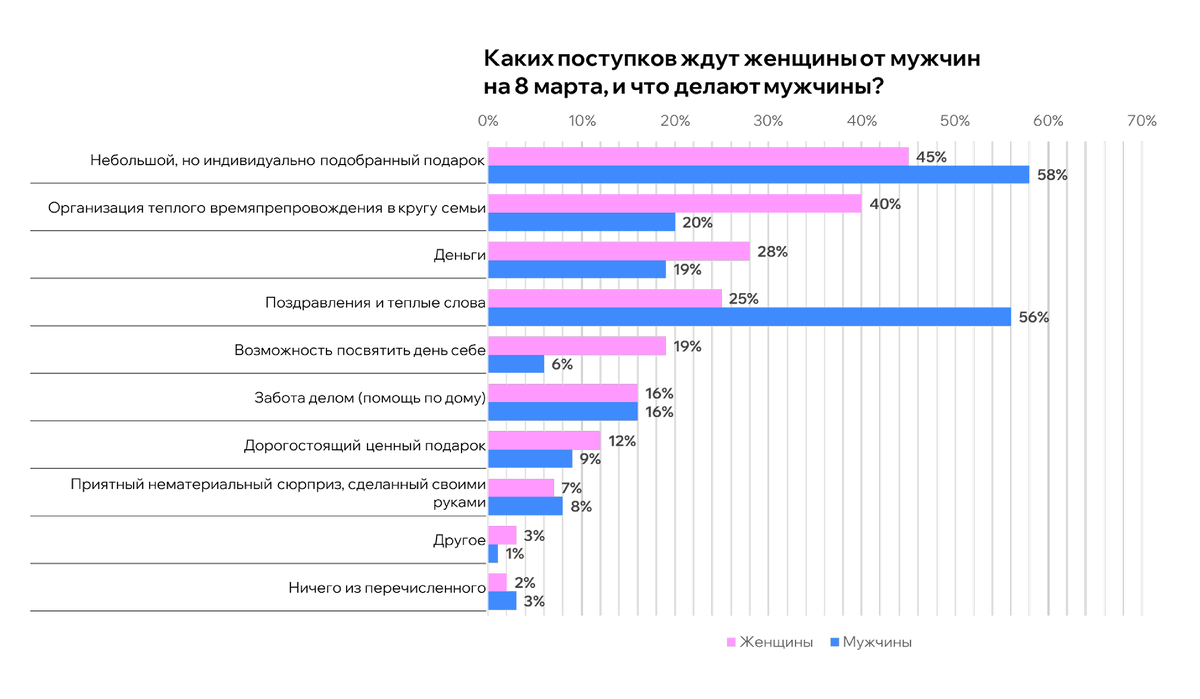 Однако есть зона, где ожидания расходятся. 40% женщин мечтают провести этот день в тёплой семейной обстановке, в кругу близких. Но лишь 20% мужчин рассматривают организацию совместного времяпрепровождения как полноценный подарок.