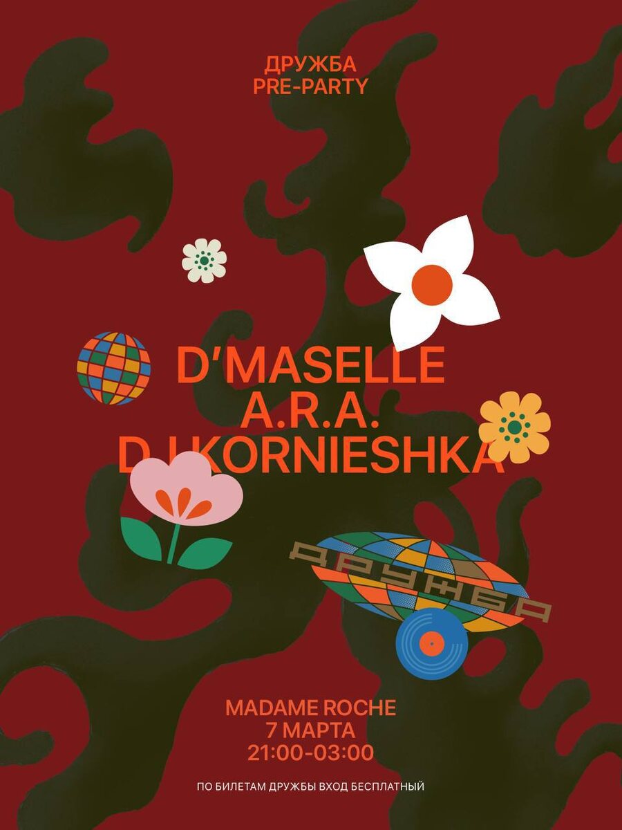 Музыка, огонь в глазах и правильный ритм до неглубокой ночи. Line-up: D’Maselle A.R.A. DJ KORNIESHKA 🎫 Вход по билетам фестиваля ДРУЖБА. FC / DC 18+ Завтра повышения цены! 🎟️ 📆 7 марта, 21:00 — 03:00 📍Madame Roche, Москва, Кожевническая ул., 16, стр. 4