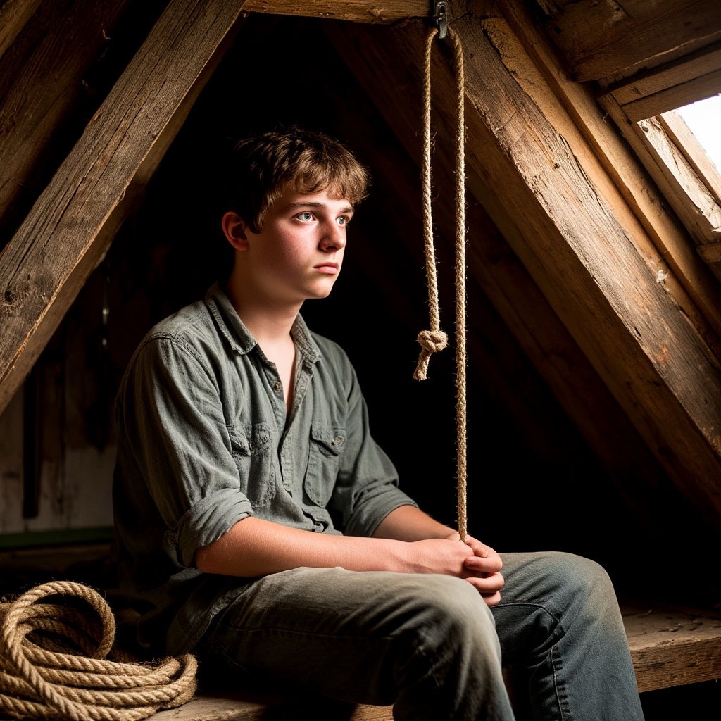 Наконец он решился, поднялся и достал из кармана верёвку, которую тайком взял в сарае. Привязал один конец к балке, проверил узел. Сердце билось так сильно, что, казалось, вот-вот выскочит из груди.