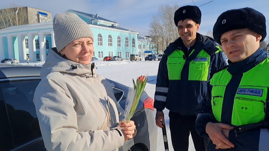 Назаровским автоледи на дорогах в городе Назарово вручали букеты цветов