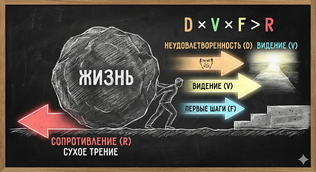 ! Итак, мы поняли ценность и скоротечность жизни, особенно с перспективой развития ИИ в ближайшие пару лет, и вышли из жертвы, став Автором своей жизни с проактивной позицией и внутренним локусом контроля. Это база, без этого все в молоко сколько ИИ не изучи! Что дальше? Дальше смотрим на простейшую Формулу Бекхарда-Глейчера показывающую возможность наступления изменений. Она выглядит следующим образом: D х V х F > R Расшифровка компонентов 🥲 D (Dissatisfaction) — Неудовлетворенность текущей ситуацией. Это осознание того, что статус-кво больше не работает и оставлять все как есть нельзя. 👀 V (Vision) — Видение будущего. Четкое, понятное и привлекательное представление о том, к чему приведут изменения. ✔️F (First steps) — Первые шаги. Конкретные, реалистичные и выполнимые действия, которые нужно предпринять для движения к видению. 🚫 R (Resistance) — Сопротивление изменениям. Естественная реакция людей или систем на перемены (страх неизвестности, нежелание тратить ресурсы, привыч