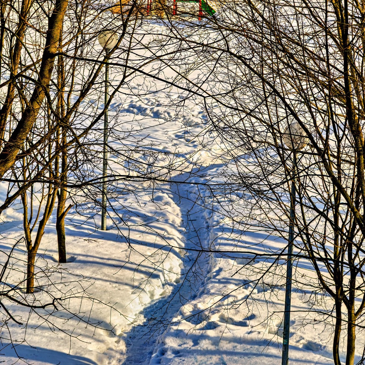 * "Ещё лежит снег серебристым покровом, Но солнце уже по-весеннему греет. Деревья стоят в кружеве золотом, И март на пороге тихонько робеет. Субботнее утро. Покой и простор. Тропинка змеится меж голых ветвей. Зима не сдаётся, ведёт разговор С весной, что крадётся всё ближе, смелей. Лучи золотые ласкают кору, И тени ложатся лазурной каймой. Ещё я морозное чувствую пору, Но пахнет уже теплотой и весной. Останься, мгновенье! Такой красоты Не часто увидишь в переходе времён, Когда пробуждаются от спячки мечты, И мир ожидает весенних перемен!"😍👍✌️ Фото сделал только что с балкона😎✌️ 🍀 Взгляд через объектив! | подписаться