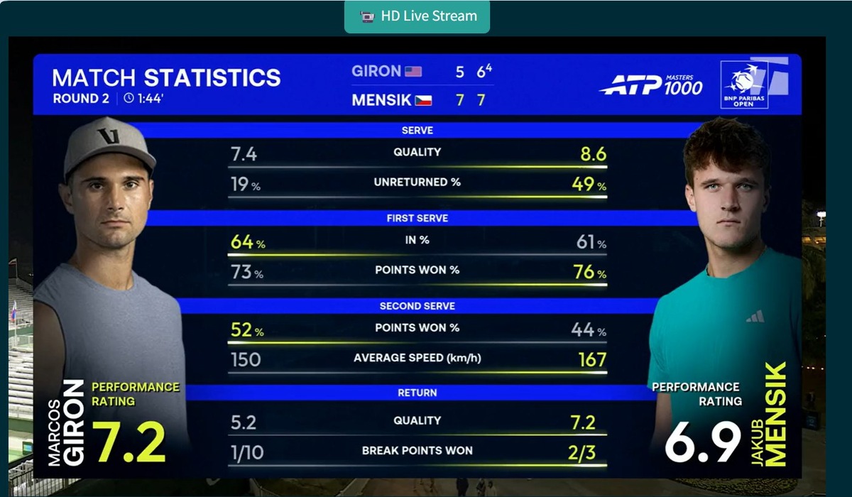⚡ Indian Wells R64: (12) Mensik def. Giron 7-5 7-6(4)