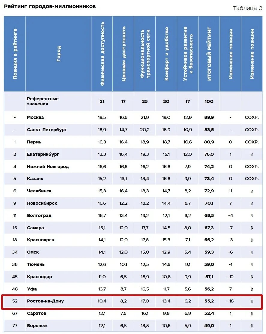 Донская столица с трудом вошла в пятый десяток рейтинга российских городов по работе общественного транспорта, набрав чуть более половины от максимально возможного количества баллов и продолжив негативную динамику последних лет. Об этом свидетельствуют данные исследования центра компетенций SIMETRA. По итогам четвертого квартала 2025 года Ростов-на-Дону занял лишь 52-е место в общероссийском списке. Эксперты оценивали работу транспортной системы городов по пяти ключевым направлениям, и мегаполис смог набрать только 55,2 балла из 100 возможных. Аналитики SIMETRA зафиксировали ухудшение ситуации по сравнению с предыдущими периодами. В 2022 году Ростов находился на 34-й позиции, однако за три года город потерял 18 пунктов в табели о рангах. Падение продолжается и в краткосрочной перспективе: текущий результат на 3,2 балла ниже показателей прошлого года (58,4 балла). В центре компетенций отмечают, что городу-миллионнику не только не удалось удержаться на прежнем уровне, но и наблюдается ус