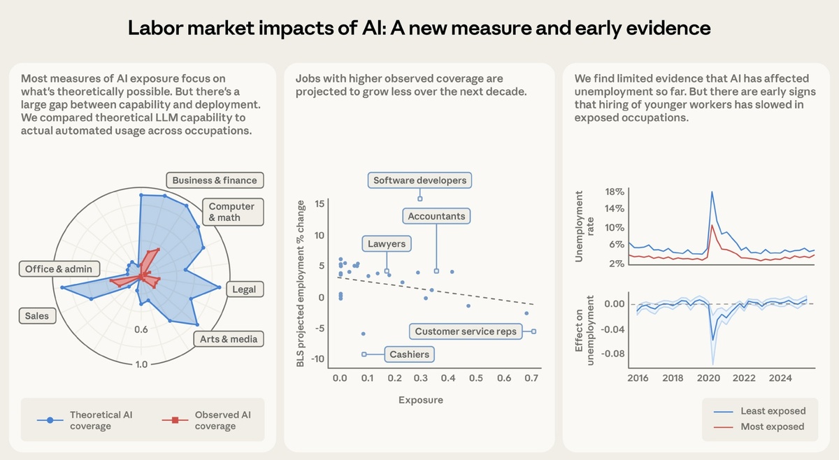 Экономисты Anthropic Максим Массенков и Питер Маккрори в своем свежем отчете от 5 марта 2026 года представили уникальный индекс, который показывает реальную пропасть между тем, что ИИ «может» делать в теории, и тем, что он «делает» на наших рабочих местах на самом деле. Исследователи обнаружили, что искусственный интеллект еще очень далек от реализации своего теоретического потенциала. Например, в сфере программирования и математики ИИ потенциально может взять на себя до 94% задач, но реальные данные использования показывают охват лишь в 33%. В список самых уязвимых профессий попали те, кто работает с данными и текстом. На вершине рейтинга оказались программисты с уровнем охвата задач в 74,5%, специалисты службы поддержки клиентов (70,1%) и операторы ввода данных (67,1%). Также под пристальным вниманием ИИ находятся финансовые аналитики и специалисты по маркетингу. Интересно, что типичный портрет сотрудника, чью работу ИИ может автоматизировать быстрее всего, это высокообразованный спе