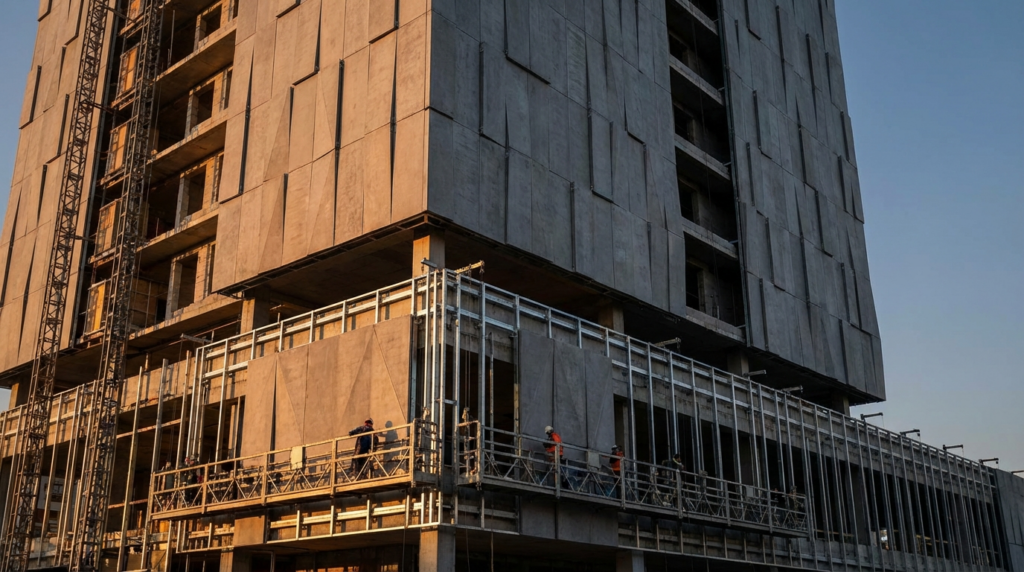 Да, монтаж возможен круглый год. Это «сухой» процесс: панели крепятся на металлическую подсистему с помощью закладных деталей или скрытых кляммеров. Никакого клея, который замерзает. Единственное ограничение — работа промышленных альпинистов или подъемников в сильные морозы и ветер, но технологически материалу холод не страшен.