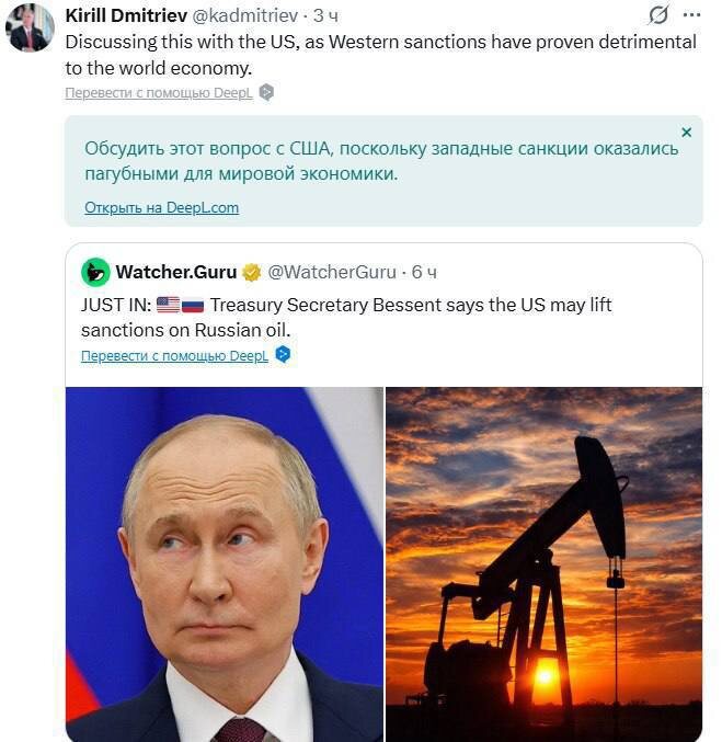 Спецпредставитель президента РФ Кирилл Дмитриев заявил, что Москва ведёт переговоры с американской стороной о возможном ослаблении санкций против российской нефти. «Западные ограничения уже показали, что они бьют по мировой экономике сильнее, чем по России», — подчеркнул он. Сайт "Другая Украина" / Telegram / Вконтакте / Центр поддержки Украинцев "Другая Украина" теперь в МАХ