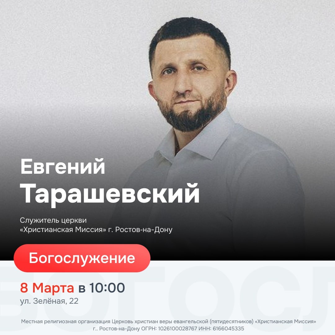 ДЛЯ ГОСПОДА 🙏🏽✨ Драгоценные братья и сёстры, приглашаем вас на воскресное Богослужение, которое пройдёт 8 марта в 10:00🕙 до служения проходит молитва в 9:30! «Шесть дней ешь пресный хлеб, а на седьмой день проведи собрание Господу, твоему Богу, и не делай никакой работы.» Второзаконие 16:8 НРП До встречи на служении!🤍 Адрес: Зелёная 22 🖥 ВКонтакте «Цхм Ростов» трансляция служения — https://vk.com/cxm.rostov 🖥 РУТУБ «Цхм Ростов» трансляция служения — https://rutube.ru/channel/39499224/ 🖥 YouTube «Цхм Ростов» трансляция служения - https://youtube.com/@cxmrostov?si=gSKP3_oMbfVza0gg
