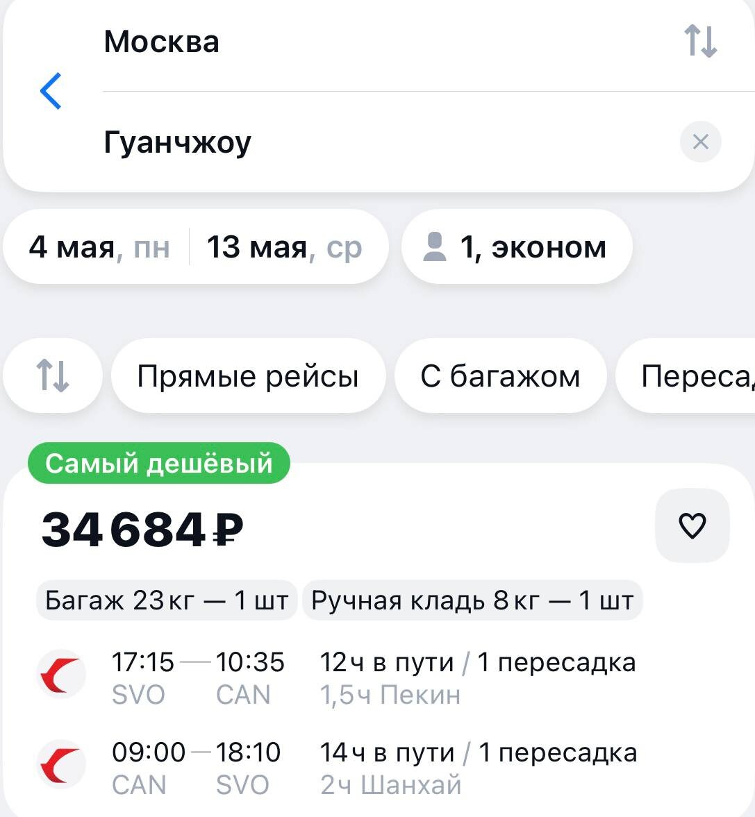 ₽ Даты: 4–13 мая Стоимость: от 34 684₽ Включено: багаж 23 кг + ручная кладь 8 кг Маршрут: · Туда: 17:15 (Шереметьево) – 10:35 (Гуанчжоу) Пересадка в Пекине: 1,5 часа · Обратно: 09:00 (Гуанчжоу) – 18:10 (Шереметьево) Пересадка в Шанхае: 2 часа Особенности: · Общее время в пути: 12–14 часов · Безвизовый въезд для россиян на 30 дней · Транзитные пересадки без визы Гуанчжоу — один из самых колоритных городов Китая. Здесь попробовать настоящий кантонский дим-сам, посмотреть на небоскрёбы вдоль Жемчужной реки и закупиться на гигантском оптовом рынке. В мае уже +28...+30°C, влажно, но до сезона дождей ещё есть время. #Гуанчжоу #Китай #Авиабилеты #Guangzhou #China #Flights @turmexanika