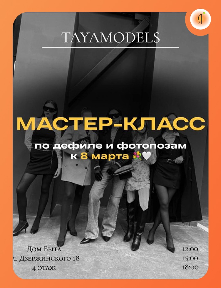 Приглашаем вас на Мастер-класс по дефиле и фотопозированию к 8 марта. Cобытие, которое раскроет вашу женственность, уверенность и харизму! 💃 Хотите красиво двигаться, держать осанку как у модели и уверенно чувствовать себя на любом мероприятии? 📸 Мечтаете получать идеальные фото без неловкости и зажатости? 🌷 Готовитесь к весенним праздникам, фотосессиям или просто хотите прокачать уверенность в себе? Тогда этот мастер-класс — для вас! 📍 Адрес: г. Якутск, ул. Дзержинского, 18, 4 этаж, после лифта два раза налево, черная дверь в конце коридора 🗓 Дата: 8 марта ⏰ Время: 13:00;15:00;18:00 (длительность 2 часа) 💰 Стоимость: 1000₽ 🎁 Количество мест ограничено, мастер-класс для любого возраста 📩 Запись +79248670000 t.me/tayamodels Online Якутия | Ждем вас в МАХ