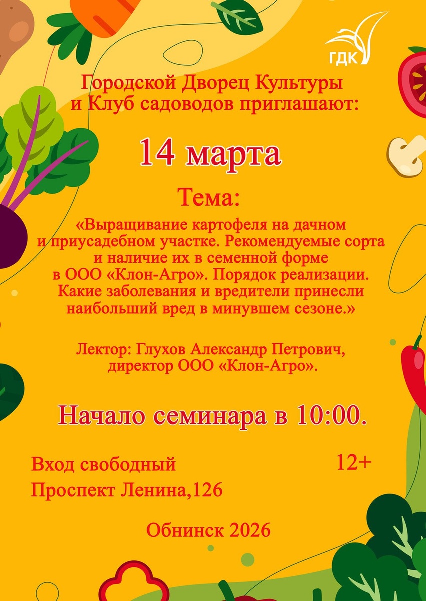 🥔Тема семинара: «Выращивание картофеля на дачном приусадебном участке». На этом семинаре вы узнаете всё самое актуальное и необходимое для получения богатого урожая картофеля: — Рекомендуемые сорта для нашего региона, которые показали наилучшие результаты. — Наличие этих сортов в семенной форме в ООО «Клон-Агро» и порядок их реализации. — Какие заболевания и вредители принесли наибольший вред в минувшем сезоне и как эффективно бороться с ними в предстоящем году. Лектор: Глухов Александр Петрович, директор ООО «Клон-Агро» – настоящий эксперт в своей области, готовый поделиться ценными знаниями и практическим опытом. Вход свободный. Обнинск, пр-т Ленина, 126. 👍 Подписаться | Ваша реклама