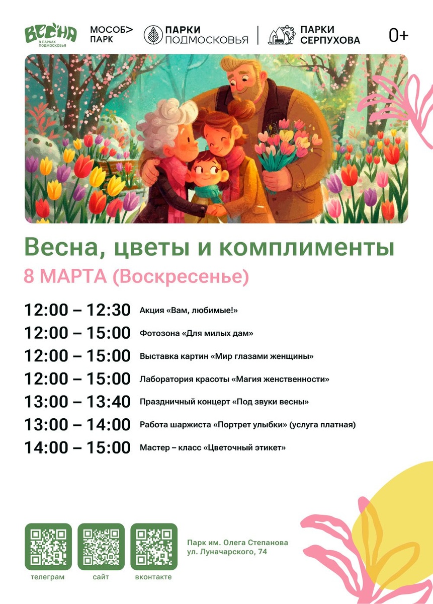 ✨ Весенний фестиваль в парке Для вас: ▪️Фотозона «Для милых дам» ▪️Акция "Вам, любимые" ▪️Выставка картин «Мир глазами женщины» (художник Оксана Пылихина) ▪️Лаборатория красоты «Магия женственности» ▪️Работа шаржиста «Портрет улыбки» ▪️Праздничный концерт «Под звуки весны» ▪️Мастер – класс «Цветочный этикет» 🚫 Возраст: 0+ 📆 08.03.2026 🕒 12:00 🏢 Парк им.Олега Степанова 📍 г. Серпухов, ул. Луначарского, д.74 💰 Вход свободный❗️ ⭐Поддержать канал голосом 💰 Канал Вакансии Серпухова ✅ Мероприятия Серпухов https://dzen.ru/id/66f01c6eb4c6fe60c9ca1608 https://vk.ru/serpukhov_events http://dzen.ru/serpukhov_events