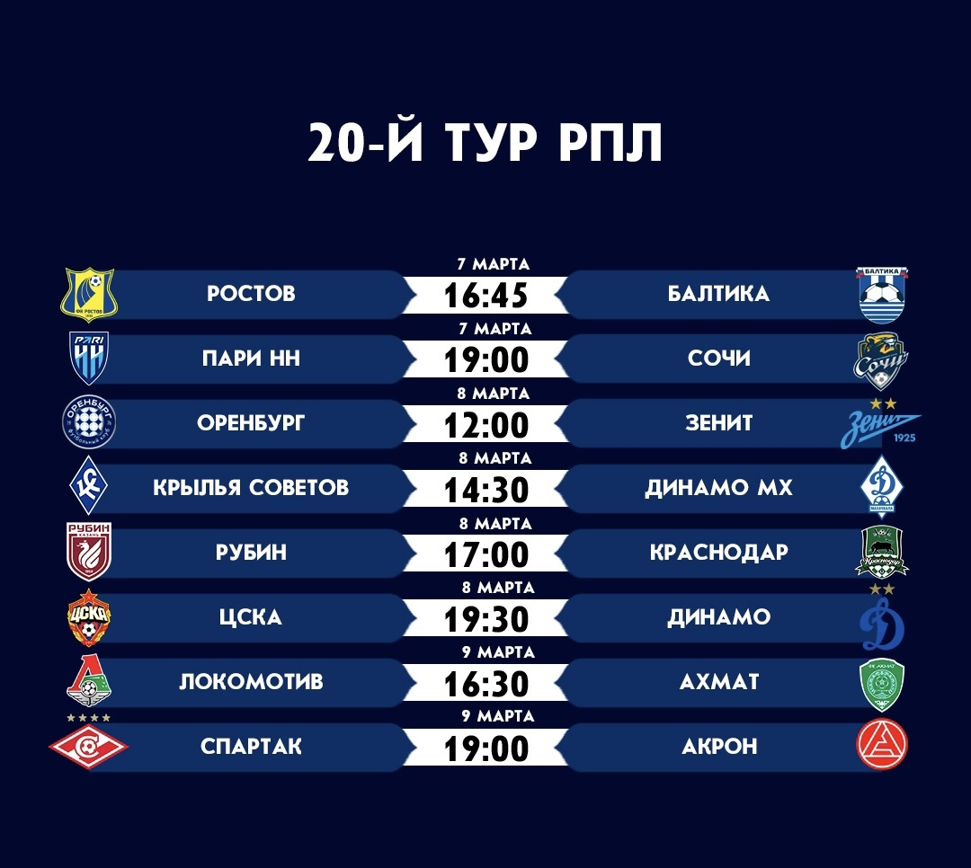 ⚽️ Расписание 20го тура РПЛ⚽️