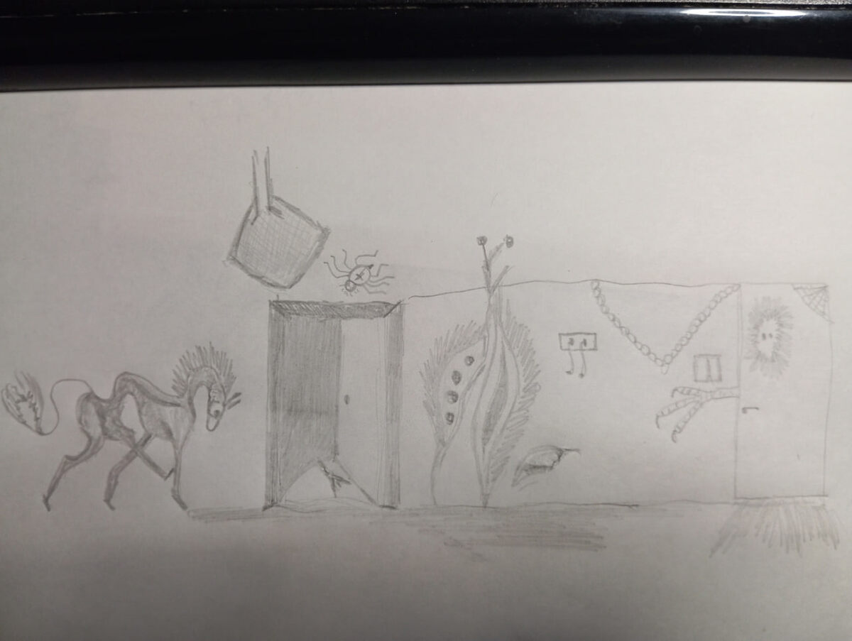 .. или mms для психиатра. Это я после медитации на остановку внутреннего диалога рисовала, одновременно слушая аудио-урок по саморазвитию. Потом скинула этот рисунок к себе в чат Телеграмма, людям показать, че там наши местные психологи скажут. И тут пишет одна женщина. Я с ее внучкой месяц назад работала и с тех пор мы тесно не общались. Привожу нашу переписку из моего ТГ-чата. Л: А я вижу прям свою квартиру, дверь входная, куда хотят засунуть лапу родственники моей внучки, рядом её комната, боится она ужасно пауков только, что ловила маленького, я их не убиваю, а отпускаю на лестничную клетку. Л: Наверху это паровая моя швабра, один в один только ,что мыла ей полы и стены. Л: И лошадь сутулая (я по гороскопу лошадь и бегу ,бегу, бегу по жизни), и цветок, это внучка растёт. Ещё вижу перышко, они меня преследуют везде, я их собираюсь и храню, (думая послания от моей доченьки) как то так!!!! Л: Я как посмотрела прям моё, блииин я в шоке Л: И на стенах у меня две картины небольших, а це