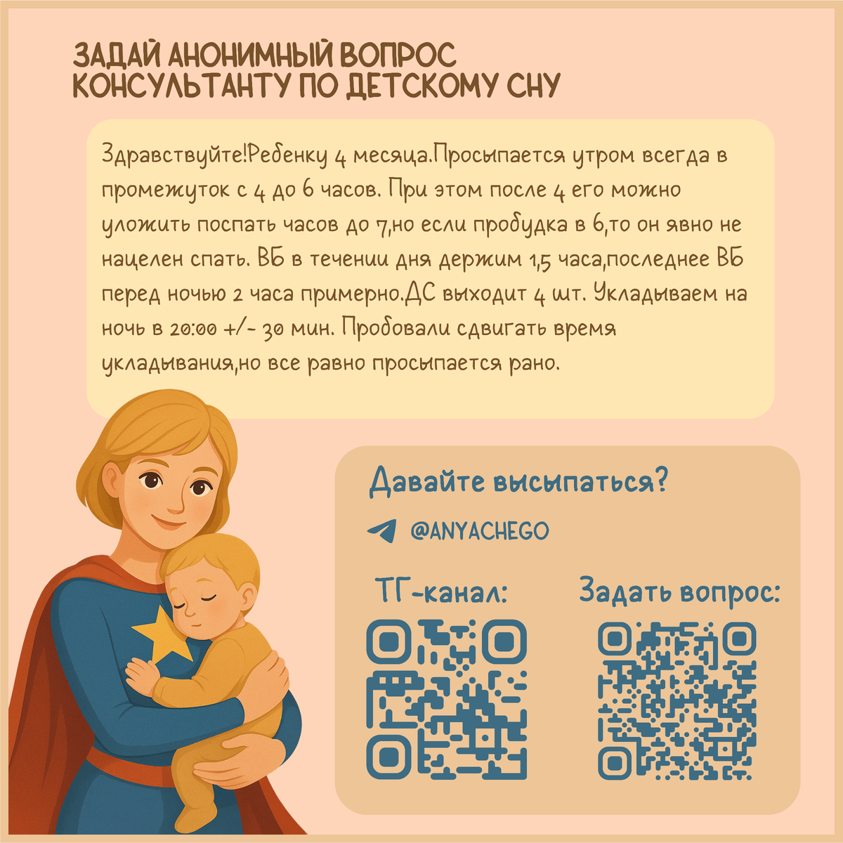 Вопрос от подписчика. Здравствуйте!Ребенку 4 месяца.Просыпается утром всегда в промежуток с 4 до 6 часов. При этом после 4 его можно уложить поспать часов до 7,но если пробудка в 6,то он явно не нацелен спать. ВБ в течении дня держим 1,5 часа,последнее ВБ перед ночью 2 часа примерно.ДС выходит 4 шт. Укладываем на ночь в 20:00 +/- 30 мин. Пробовали сдвигать время укладывания,но все равно просыпается рано. Давайте сначала определимся с проблемой: Ситуация 1️⃣: Пробуждение в 4 утра + долгое укладывание ➡️ Если ребенок просыпается в 4 утра и не может уснуть обратно (вы укладываете его, а он долго не засыпает) - это называется ночное гуляние. ➡️ Если ребенок не засыпает после укладывания и пробуждение получается раньше 6 утра, то эта проблема называется - ранний утренний подъем И то, и другое - проблемы, которые требуют коррекции режима. Ситуация 2️⃣: Пробуждение в 6 утра + "не нацелен спать" А вот это уже НЕ проблема. Пробуждение в 6 утра - абсолютная норма для ребенка (особенно с уклады