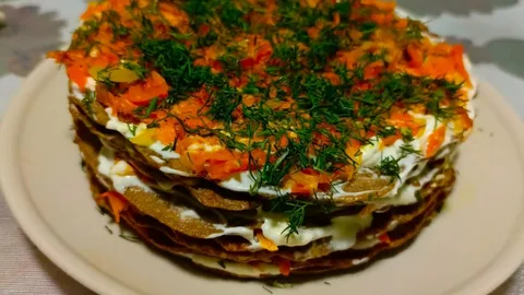 - Каждый печеночный блин смазать майонезом, а затем выложить на него обжаренный лук с морковью. Коржи выложить друга и дать торту настояться 2 часа.