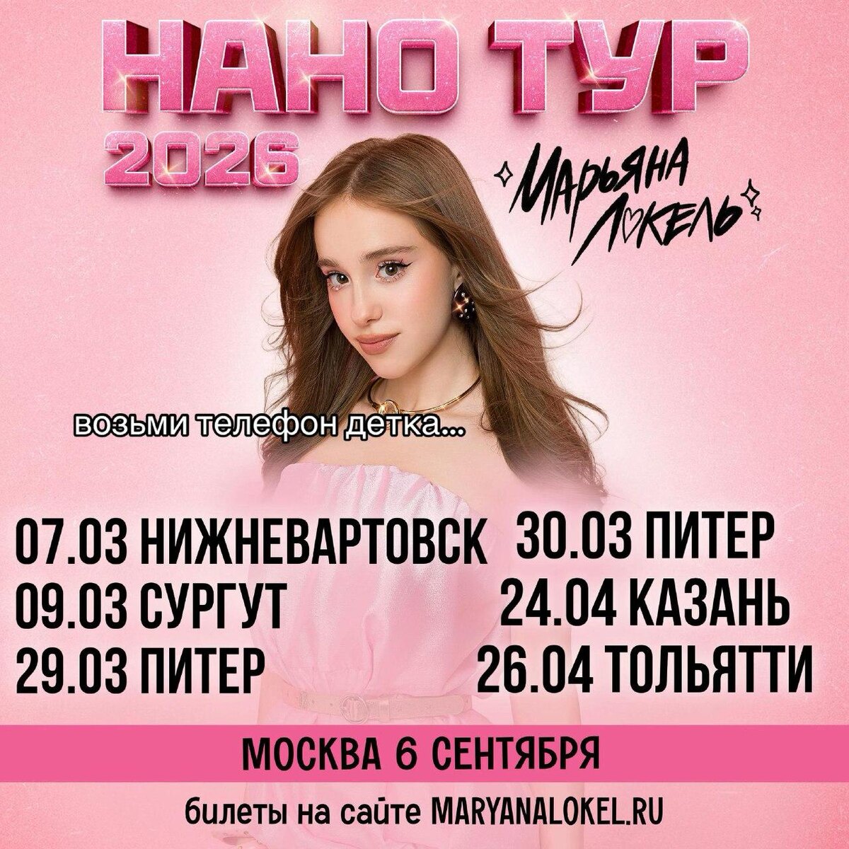 🎤 – Марьяна Локель 📍 – 6 городов: Нижневартовск, Сургут, Санкт-Петербург, Казань, Тольятти, Москва 🗓 – 7 марта – 26 апреля, Москва – 6 сентября 💵 – от 1 500 руб. 🔗 – билеты (6+) #концерты #билетынаконцерт #марьяналокель #нанотур #нижневартовск #сургут #санктпетербург #казань #тольятти #москва 👉 Список концертов: март • апрель • май @est_prohodka