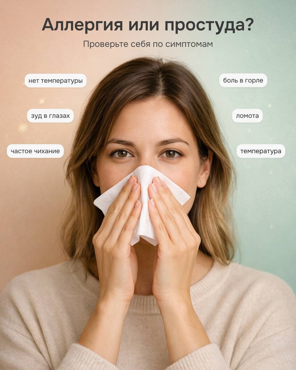 Но что это — простуда или аллергия? Симптомы могут быть похожими, однако есть несколько важных отличий. 👇🏻 Скорее всего это простуда, если: • есть повышенная температура • ощущается ломота в теле и слабость • болит горло • насморк сначала водянистый, а через несколько дней становится густым • симптомы проходят примерно за 5–7 дней 👇🏻 Вероятнее всего это аллергия, если: • появляется частое чихание подряд • беспокоит сильный зуд в носу, глазах или горле • слезятся и краснеют глаза • насморк прозрачный и водянистый • симптомы появляются в одно и то же время года или после контакта с аллергеном • состояние не сопровождается температурой 💡 Важно: аллергия может длиться неделями и усиливаться при контакте с аллергеном, а простуда обычно проходит сама. Если симптомы сохраняются или мешают привычной жизни — лучше обратиться к врачу. Специалист поможет определить причину и подобрать правильное лечение. Берегите здоровье и не занимайтесь самолечением! 📍Записаться на консультацию в