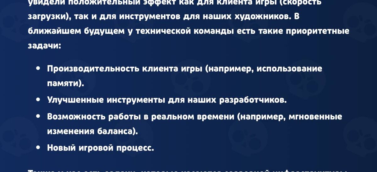 Фрэнк выпустил блог, в котором рассказал о состоянии Brawl Stars в 2025 году, а также поделился целями на этот год: • Улучшение производительности клиента игры; • Улучшенные инструменты для разработчиков; • Возможности работы в реальном времени. Например, вводить баланс моментально, без перерыва; • Новый игровой процесс. Больше нам расскажут в дорожной карте, которая выйдет в этом месяце. ✅Новости по Clash Royale - ТЫК Мир Supercell. Подписаться