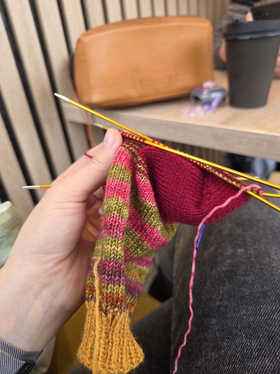 Продуктивно ждём ребенка с занятий. Второй носок довязала до половины, ещё немного и оба будут готовы.