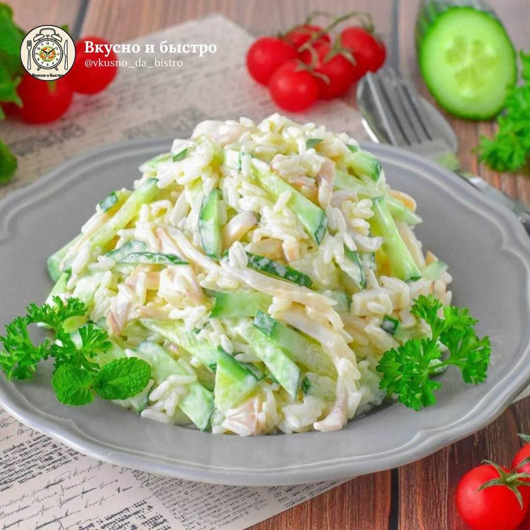 #салат #пп #15мин 🕒 Время приготовления 15 мин Порции 2 Сложность: легко 🧾 Ингредиенты: 🟠Рис — 5 ст. л. 🟠Кальмары — 2 тушки 🟠Огурцы — 2 шт. 🟠Соль, перец, майонез — по вкусу 🍴Приготовление: 1. Отварите рис и кальмары до готовности. Остудите. 2. Нарежьте огурцы небольшими кусочками, кальмары — полукольцами или мельче. 3. Сложите все ингредиенты в миску, посолите, поперчите и заправьте майонезом. Хорошо перемешайте. Вкусно и Быстро | Мы в Мах 📲