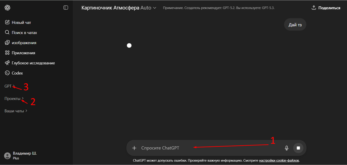 Перед началом работы с изображениями важно выбрать формат среды, в которой будет происходить генерация. В ChatGPT существует три основных режима работы: обычный чат (1), проекты (2) и кастомные GPT (3). Каждый из них подходит для разных типов задач.