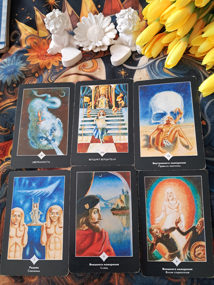 Этот расклад на картах Вадима Зеланда (Трансерфинг реальности) говорит о глубоком внутреннем конфликте и одновременно о мощном импульсе к переменам. Душа кричит о том, что вы застряли между старыми способами управления реальностью (внутреннее намерение) и необходимостью отпустить контроль, позволив миру самому привести вас к цели (внешнее намерение). Давайте разберём каждую карту.