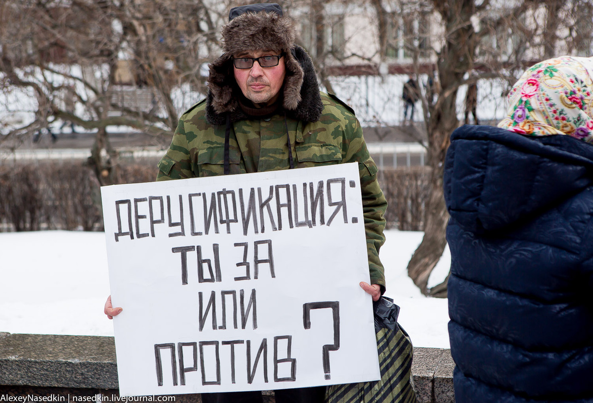 Этот грустноватый гражданин, мёрзнущий с плакатом на пронизывающем ветру, отныне может спать спокойно. Ведь на смену дерусификации победно взошла самая что ни на есть русификация. С 1 марта названия заведений, таблички и рекламные баннеры теперь должны быть на русском. По всей стране бизнес в спешке переделывает витрины и навигацию и... жалуется на внезапные расходы.