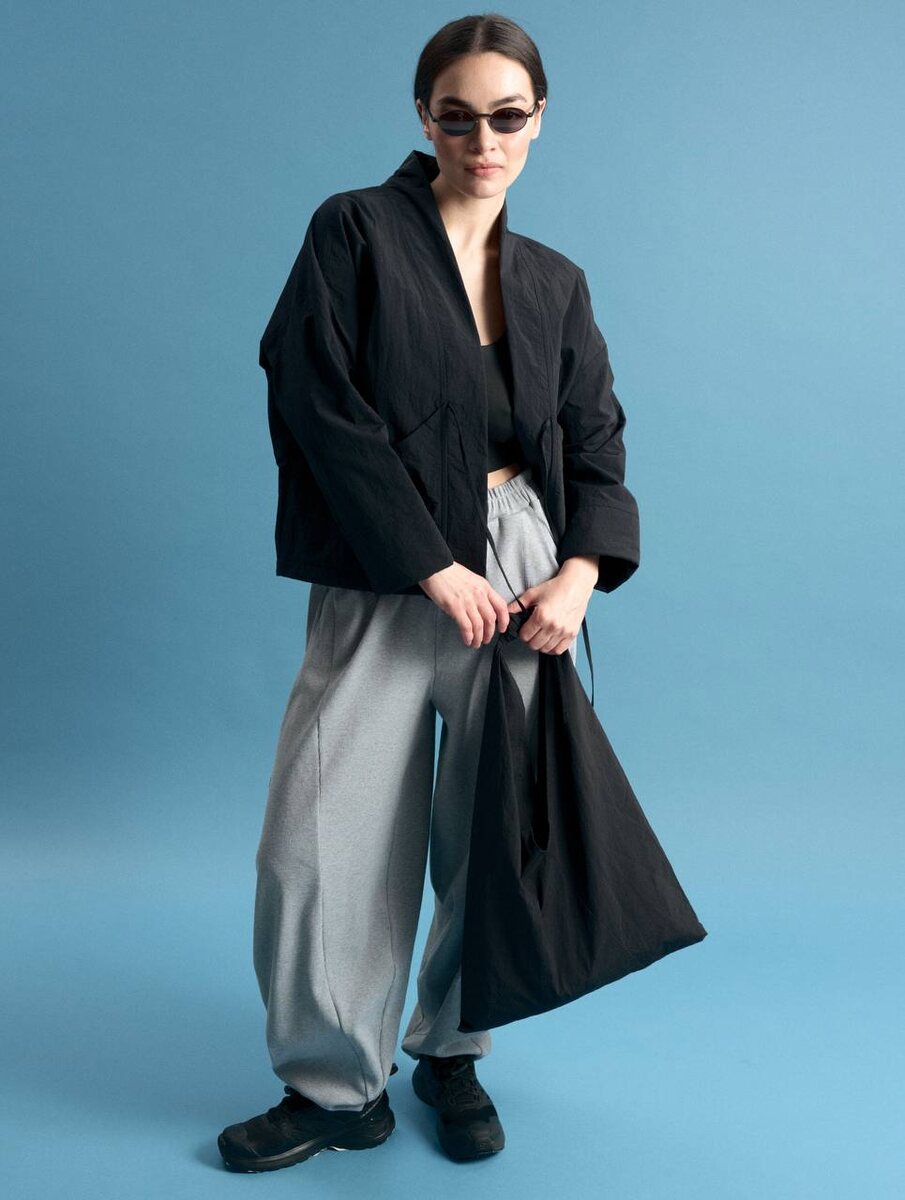 Получилось нечто среднее между ветровкой и жакетом. Ранней весной собираемся носить хаори под пальто, а в тёплом мае и летними вечерами как лёгкую куртку. p.s. запас сумок-узелков из непромокаемого нейлона тоже пополнен, забирайте, пока действует скидка 🙂