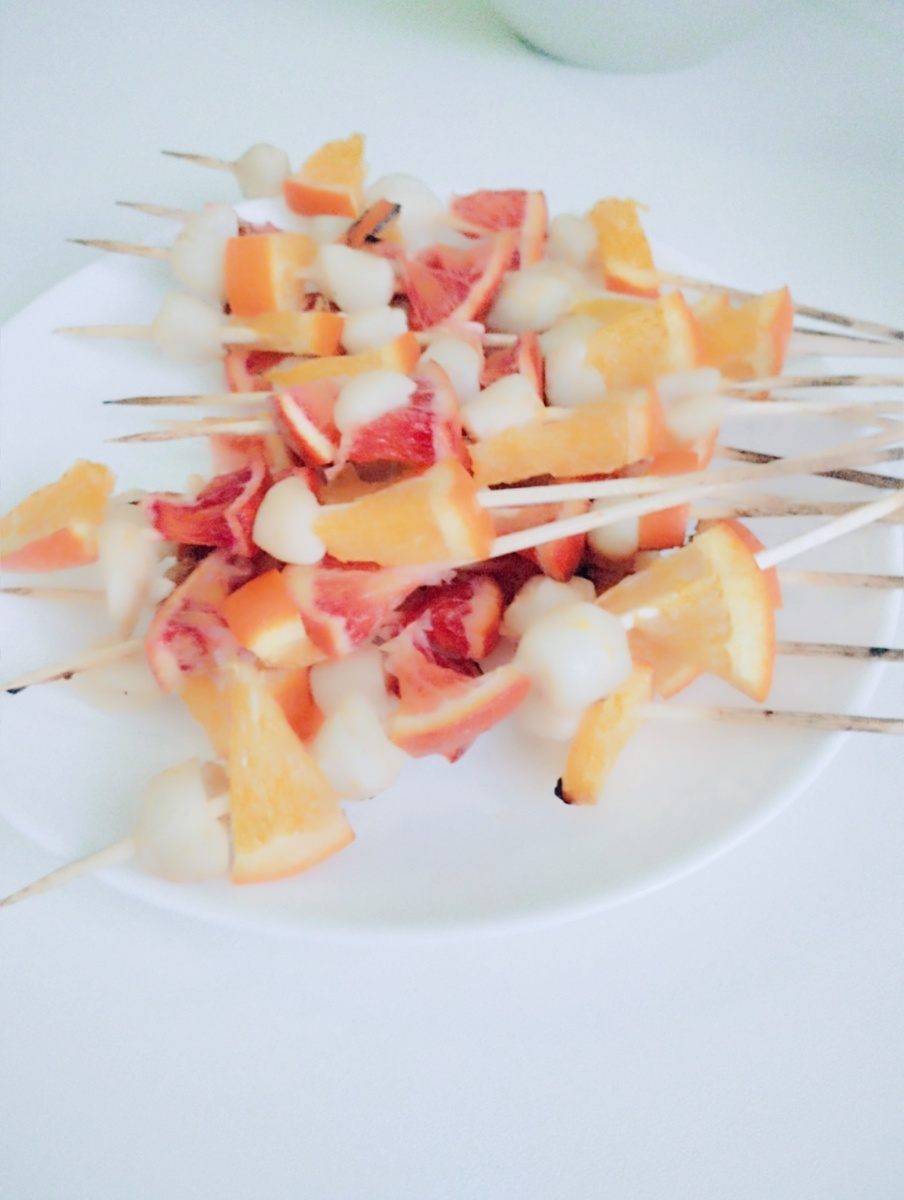 Затем нанизать гребешок и дольки апельсина на оливковом масле по 1 минуте с каждой стороны на среднем огне.