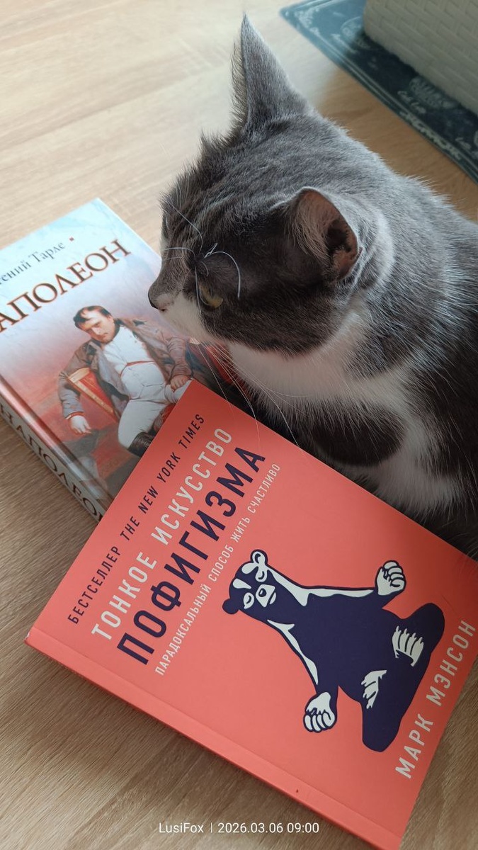 - Шунь, ты чего там караулишь? - Хе, не видишь что ли? Хозяйке тут надарили новых полезных книжек. А ей все мало, они с тетей Ирой в библиотеку сходили, и ещё по штучке себе выбрали. И когда только время на чтение находят? - Книжки-то интересные? Или так себе? - Я не читала, но одна из них наверняка дурацкая. Ну сама подумай, название - "Если все кошки в мире исчезнут". Глупость-то какая! Вперёд кошек исчезнут люди, потому что мозгов у них нет, а агрессии полно. "Наполеон" Е. В. Тарле - это напоминание о суровых временах, чтоб не ныли и не жаловались. А вот книжку про пофигизм я порекомендую к чтению. Хотя можно просто брать с тебя пример и достаточно. - Надо же, Шушунька, какой ты знаток литературы, хоть и неграмотная😸. - Дык я эНту литературу через пузо впитываю, каждой клеточкой и шерстинкой. Полежала на книжке - и впитала смысл и эмоции. Людям до моих способностей ещё расти и расти!😺☝️