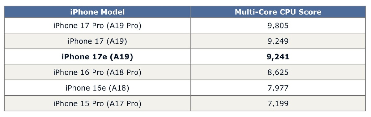 Посмотрите на цифры внимательнее: бюджетный iPhone 17e в многоядерном тесте Geekbench 6 набирает 9241 балл — это больше, чем у прошлогодних
