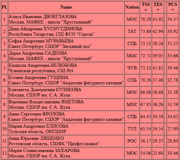 Женская короткая программа прошла на очень высоком уровне, но не без грубых ошибок, хотя на лед вышли 12 лучших фигуристок России. Об ошибках чуть ниже, а в предисловии хочется отметить, что 6 прокатов оценены суммой больше 70 баллов. Отдельно отмечу успешное исполнение тройного акселя Диной Хуснутдиновой и Камиллой Нелюбовой, а также просто идеальный прокат Алисы Двоеглазовой.