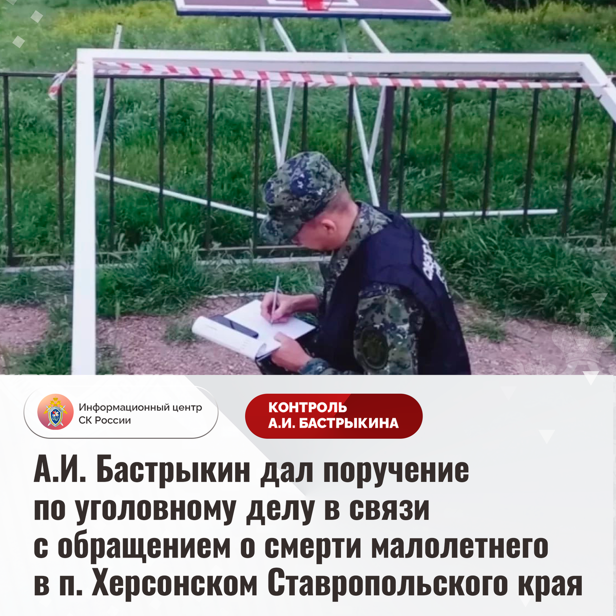 А.И. Бастрыкин дал поручение по уголовному делу в связи с обращением о смерти малолетнего в п. Херсонском Ставропольского края К Председателю СК России А.И. Бастрыкину через Информационный центр обратилась жительница Ставропольского края по вопросу несогласия с ходом установления обстоятельств смерти ее 11-летнего сына в поселке Херсонском. В мае прошлого года на малолетнего упали ненадлежащим образом закрепленные футбольные ворота на детской площадке. Пострадавший скончался на месте. Расследование уголовного дела приняло затяжной характер, до настоящего времени никто к ответственности не привлечен. Указанная ситуация освещалась в СМИ. В СУ СК России по Ставропольскому краю расследовалось уголовное дело, которое в феврале текущего года направлено в суд для рассмотрения по существу по ст. 238 УК РФ. Кроме того, в региональном следственном управлении расследуется уголовное дело по ст. 293 УК РФ (халатность). Председатель Следственного комитета Российской Федерации Александр Иванович Баст
