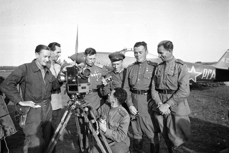 В центре группы с фотоаппаратом в руках фотограф Аркадий Шайхет, слева в комбинезоне начальник киногруппы 1-го Украинского фронта капитан Михаил Ошурков, за его спиной стоит режиссер Центральной студии документальных фильмов Яков Авдеенко. Справа – фронтовой кинооператор Валентин Орлянкин. Сидит, предположительно, оператор Исаак Кацман. На пределе🔥