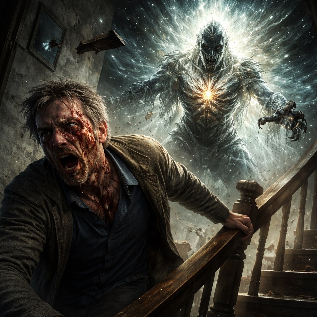Сверху двигалось что-то тяжёлое: шаг — скрип — грохот, будто по коридору катили рассохшийся гроб. Потом — треск, и дверь в подвал разлетелась древесной пылью. В проёме вспухло ослепительное сияние; лестница вниз превратилась в нисходящий луч. В этот свет входил фантом: беспорядочный столб бликов, зеркальные ленты, хрустальный скрип.