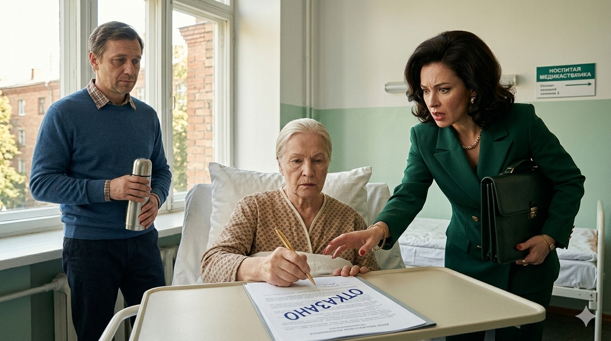 — Ой, мам, ну зачем ему знать? Он же сразу скандал устроит. Подписывай быстрее, пока врач не пришел. Это же для твоего блага!