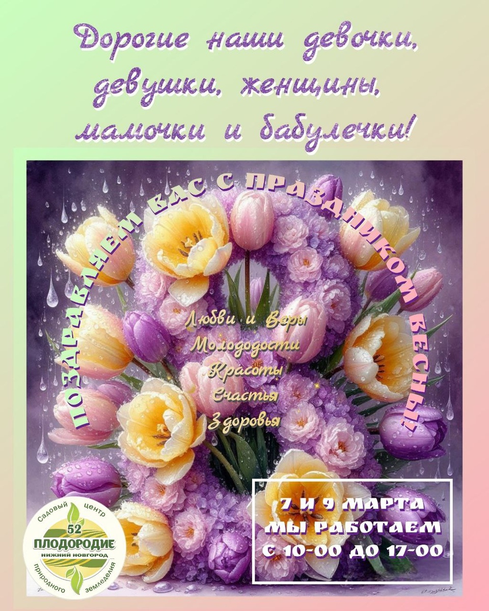 ! 🌷 ПЛОДОРОДИЕ52 поздравляет вас с 8 марта! Вы — главное украшение этого мира, источник красоты и вдохновения. Пусть весна играет яркими красками, настроение цветёт, а любимый сад радует с каждым днём всё больше ✨ 🌸 В честь праздника — особый режим работы: ❣️ 7 марта — работаем с 10:00 до 17:00 💚 8 марта — выходной ❣️ 9 марта — снова ждём вас с 10:00 до 17:00 Успевайте заглянуть к нам 7 и 9 марта — именно в эти дни действуют все наши предпраздничные предложения, подарки и максимальные скидки. Выбирайте растения с выгодой, получайте приятные бонусы и участвуйте в розыгрыше «Счастливого чека» — итоги подведём 9 марта в 20:00. Пусть этот праздник подарит тепло, улыбки и много-много цветов — в саду и на душе 🌷 📍 Садовый Центр ПЛОДОРОДИЕ52 📞 8-953-4-153-129 🕒 7 и 9 марта с 10:00 до 17:00, 8 марта — выходной 👉 Подробности акций здесь: vk.ru/wall-47233121_10185 предзаказ со скидкой 15% по промокоду #ВеснаНаУлице2026 — в нашем каталоге vk.com/albums-47233121