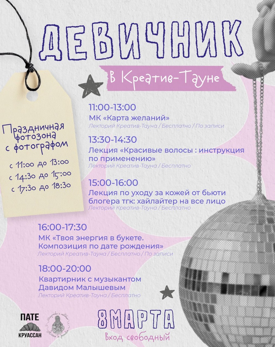 ?☺️ Предлагаем сделать это ярко и красочно! #идёмплатно и #идёмбесплатно в 8 и 9 марта в креатив-таун ➡️ Уточнить все детали можно, написав в л/с группы организаторов 💬«Приготовили для вас насыщенную программу на эти два дня: на лекциях узнаем, как правильно заботиться о себе, сделаем фотографии возле праздничной фотозоны и, конечно, посетим мастер-классы», — отметили организаторы. Регистрация: — 11:00 — МК «Карта желаний» | Запись; — 16:00 — МК «Твоя энергия в букете. Композиция по дате рождения» | Запись. Ставьте — ❤️, если вы готовы творить! Не забудьте подписаться на наш канал в MAX❤️