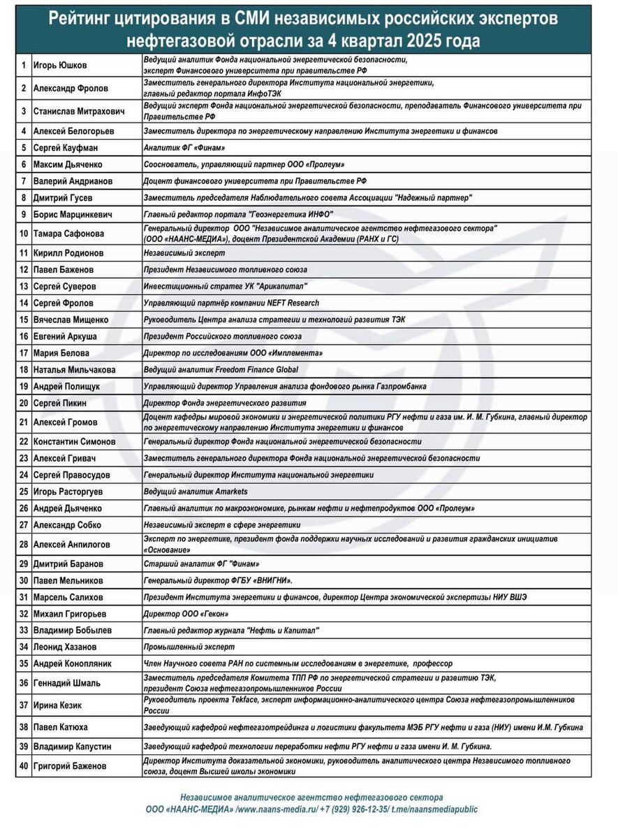 🆕 НААНС-МЕДИА представляет рейтинг независимых российских экспертов по нефтегазовой отрасли за 4 квартал 2025 года