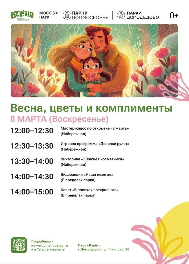 ✨ Дорогие девушки, с наступающим 8 Марта! 🩷 Пусть этот весенний день подарит вам море улыбок, тёплых слов и волшебных мгновений! Приходите сами, зовите подруг, мам, дочерей - пусть этот день станет по‑настоящему особенным для каждой! Мы верим, что вместе создадим атмосферу радости, вдохновения и весеннего чуда. Приглашаем окунуться в атмосферу весеннего праздника и зарядиться хорошим настроением! Вас ждут: • ️Мастеры-классы по росписи шопперов (платный) и макияжу • ️Мастер-класс по созданию открытки на «8 марта» • ️Интерактивная точка «Волшебная изонить» • ️Игровая программа • ️Видеоакция «Наши нежные» • ️Квест «В поисках прекрасного» 📆 08.03.2026 ✅ Мероприятия Домодедово https://dzen.ru/id/66f10385cc4c5a16f7b5fb02 https://vk.ru/domodedovo_events http://dzen.ru/domodedovo_events