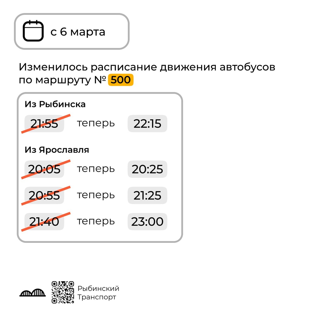 С 6 марта изменилось время отправления вечерних рейсов по маршруту №500 «Рыбинск АВ — Ярославль-Гл. АС». Вечерние отправления: 🚍 Из Рыбинска: Рейс в 21:55 перенесён на 22:15 🚍 Из Ярославля: • 20:05 → 20:25 • 20:55 → 21:25 • 21:40 → 23:00 Дневные рейсы остаются без изменений. Полное расписание: 📌 От Рыбинск АВ: 05:30, 06:30, 07:40, 08:00, 08:25, 09:00, 09:20, 10:00, 10:30, 10:50, 11:30, 11:50, 12:20, 12:50, 13:20, 13:50, 14:20, 14:55, 15:20, 15:50, 16:30, 16:50, 17:20, 17:50, 18:20, 18:50, 19:30, 20:05, 20:30, 21:00, 21:25, 22:15 📌 От Ярославль-Гл. АС: 05:50, 06:10, 06:30, 07:00, 07:30, 08:00, 08:30, 09:00, 09:30, 10:00, 10:30, 11:00, 11:30, 12:00, 12:30, 13:00, 13:30, 14:00, 14:30, 15:00, 15:30, 16:00, 16:30, 17:00, 17:30, 18:00, 18:30, 19:00, 19:30, 20:25, 21:25, 23:00