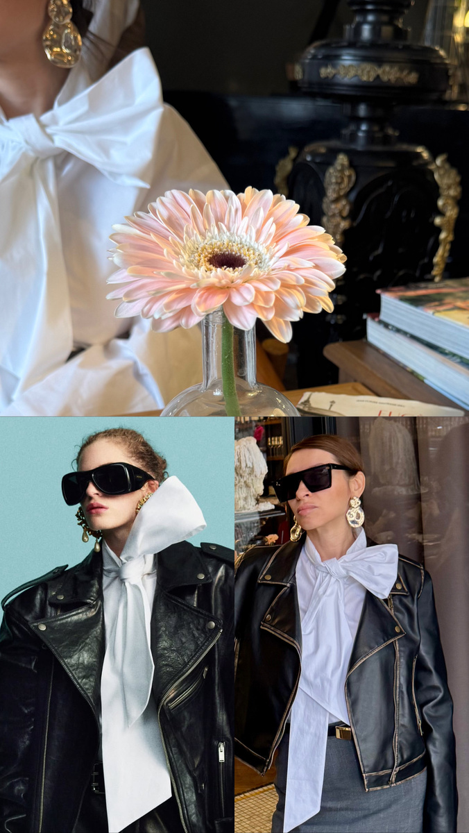 Чтобы создать образ в стиле Ив Сен-Лорана, важно сосредоточиться на ключевых элементах его эстетики: балансе маскулинности и женственности, лаконичности кроя, игре с текстурами и ярких деталях. Рассмотрим, как повторить этот стиль с помощью базовых вещей и акцентных аксессуаров. Ключевой элемент новой коллекции 2026 от модного дома — это жакет или кожаная куртка с акцентированной линией плеч. Модели отличаются широкими лацканами, подплечниками и лаконичным кроем, но при этом имеют выразительный силуэт. Я выбрала кожаную косуху оверсайз с эффектом потертости в винтажном стиле. Куртка из качественной кожи или экокожи будет идеальным выбором. Акцент на плечи добавляет интересный контраст к женственным элементам образа. Блуза с бантом Фирменный акцент Ив Сен-Лорана — объёмные банты и воротники. Для повторения образа выбираем белую или пастельную блузку с крупным бантом. Лучше отдать предпочтение легким тканям, таким как шелк, атлас, креп или плотный хлопок. В своем образе я выбрала объе