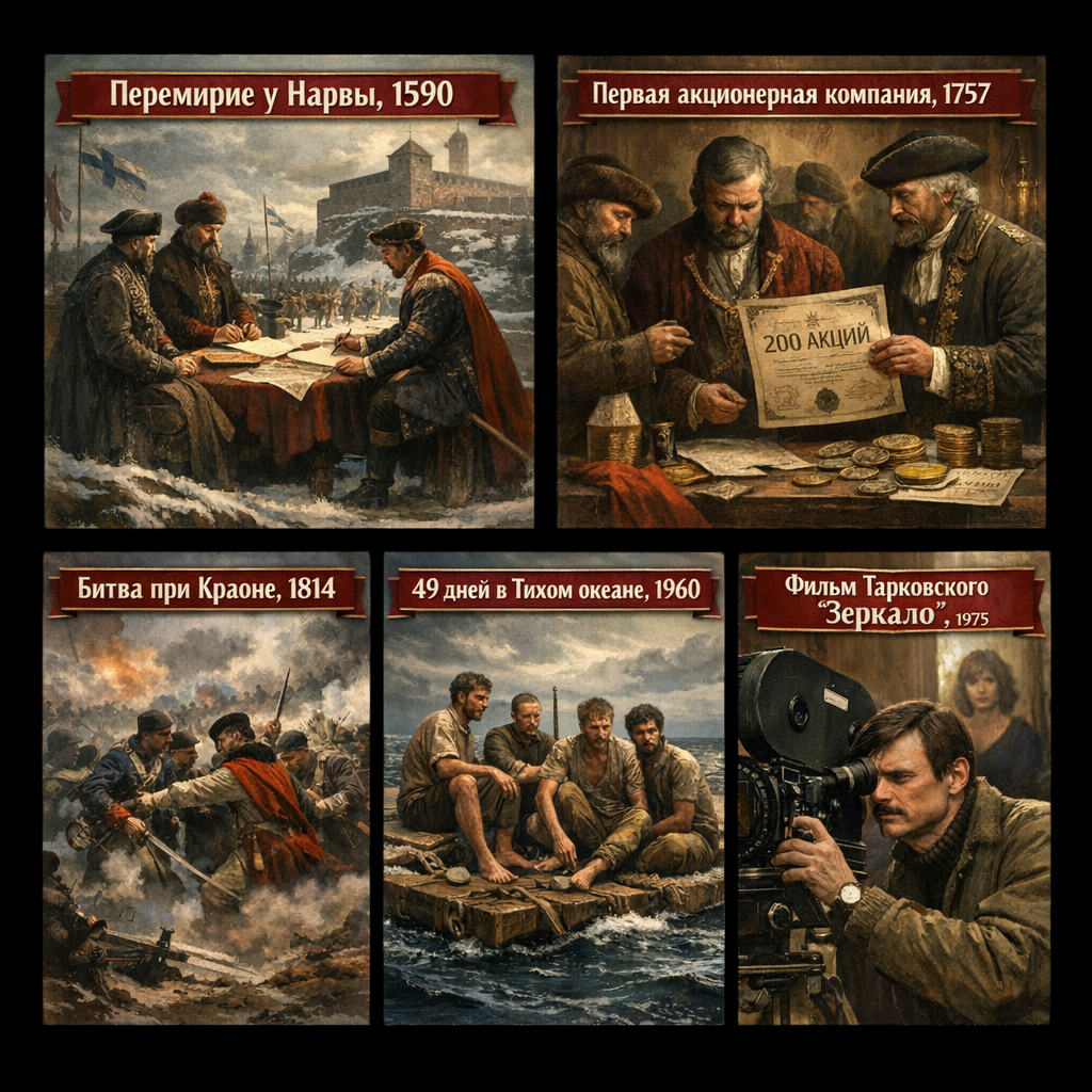 Пять дат — одна формула Тихий океан, январь 1960-го. Баржу Т-36 унесло в открытый океан во время шторма. Четыре солдата: Зиганшин, Крючковский, Федотов, Поплавский. Средний возраст — 20 лет. Запасов еды — на двое суток. Они продержались 49 дней. Ели кожаные ремни, сапожные подошвы, гармонь — буквально. Пили дождевую воду из складок брезента. Когда американский авианосец их обнаружил, моряки не поверили, что люди в таком состоянии вообще живы. Хрущёв встретил их в Москве лично. 🗓 Но эта дата — 7 марта — богаче, чем один подвиг. 1590 год. Русские войска после серии побед подписывают перемирие со Швецией у Нарвы. Возвращают Ям, Ивангород, Копорье — земли, потерянные в Смуту. Карамзин написал об этом с едва скрытым сожалением: требовали Нарву и всю Эстонию, а царь Фёдор Иоаннович «удовольствовался восстановлением древнего рубежа». Сдержанность как государственная мудрость. Или осторожность. Историки спорят до сих пор. 1757 год. Россия создаёт первое акционерное общество — «Российская в