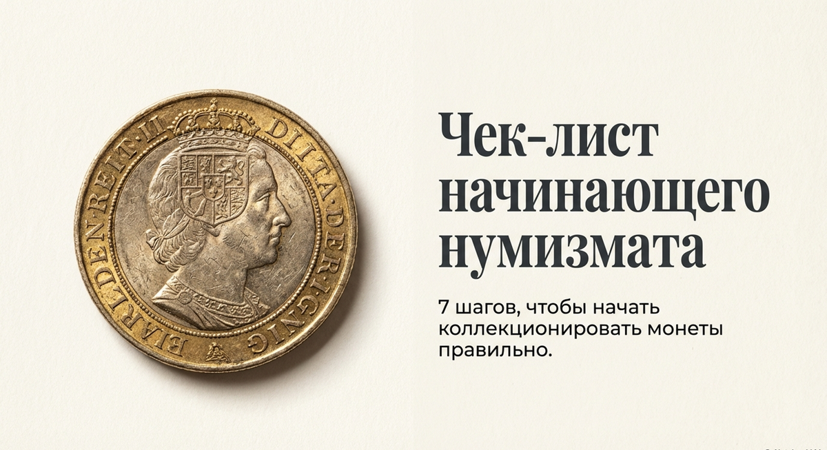 Вы решили заняться коллекционированием монет? Вот пример чек-листа для начинающего нумизмата, который можно использовать. Он простой, практичный и мотивирует начать коллекционирование. 7 шагов, чтобы начать коллекционировать монеты правильно 1. Определите направление коллекции Не собирайте всё подряд. Выберите тему: ☐ Монеты одной страны ☐ Монеты определённого периода (например, СССР) ☐ Юбилейные и памятные монеты ☐ Монеты с животными / символами ☐ Биметаллические монеты ☐ Инвестиционные монеты Совет: узкая тема делает коллекцию ценнее и интереснее. 2. Проверьте монеты, которые уже есть дома Начните с того, что у вас под рукой: ☐ Копилка ☐ Старые кошельки ☐ Монеты от родственников ☐ Путешествия и сдача из других стран Иногда редкие монеты уже лежат дома. 3. Изучите базовые параметры монет Каждая монета имеет характеристики: ☐ Год выпуска ☐ Монетный двор ☐ Тираж ☐ Состояние (сохранность) ☐ Металл Эти параметры сильно влияют на цену. 4. Купите базовые аксессуары нумизмата ☐ Альбом или хо