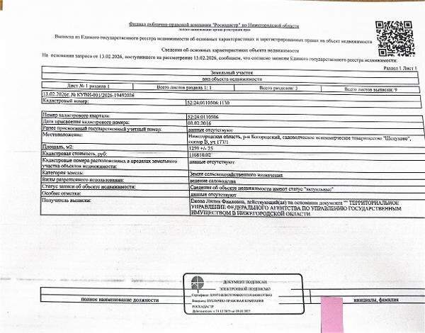м, кадастровый (или условный) номер 52:24:0110506:1130, категория земель - земли сельскохозяйственного назначения, вид разрешенного использования – ведение садоводства. Местоположение: Нижегородская обл., Богородский р-н, СНТ «Шелухово», сектор В, земельный участок 177/1. Должник – Кузнецов И.В. Канал: Госземля Нижегородская область Область: обл Нижегородская Нижегородская обл. Район: Богородский р-н Населенный пункт: СНТ «Шелухово», сектор В, земельный участок 177/1 Локация: Смотреть на карте ВРИ: Садоводство Кадастровый номер: 52:24:0110506:1130 Кадастровая стоимость: - Вид сделки: Продажа Площадь: 1259 м² Начальная цена: 711335.00 руб. Дата завершения: 09.04.2026 Подробнее: ГИС ТОРГИ #госземля #земляотгосударства #земля #земельныйучасток #земельныеторги #торги #аукцион #продажаземли #продажа #нижегородскаяобласть