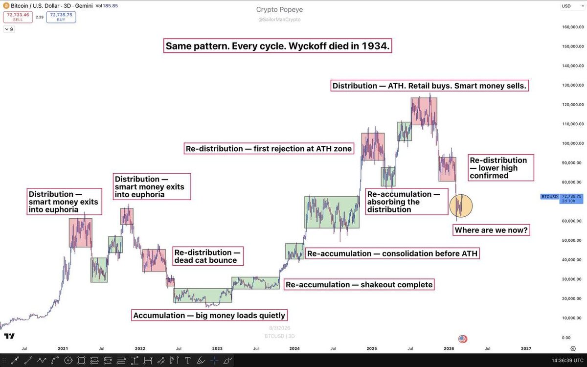 Но его карта до сих пор работает на биткоине. Посмотрите на этот график внимательно. Каждый зелёный блок — накопление. Каждый красный — распределение. И эта структура повторяется снова и снова. В каждом цикле. Без исключений. Это не случайность. Это поведение людей. Зелёная зона — накопление. Крупные игроки тихо набирают позиции. Цена стоит на месте неделями или месяцами. Объём падает. Интерес пропадает. Розничные инвесторы скучают и уходят. А потом начинается импульс. Красная зона — распределение. Крупные деньги продают в эйфорию. Цена выглядит сильной. Новые ATH. Новости максимально бычьи. Ритейл покупает всё подряд. Но умные деньги уже выходят. Так было: — в 2021 — в 2022 — в 2024 — в 2025 И это происходит снова прямо сейчас. Мы только что вышли из красной зоны распределения. Биткоин упал с $125k до $72k за считанные недели. Пока ритейл праздновал новый ATH — крупные деньги продавали. Теперь главный вопрос: Мы уже в накоплении перед следующим ростом или это re-distribu