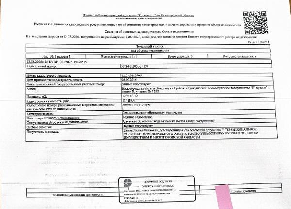 м, кадастровый (или условный) номер 52:24:0110506:1137, категория земель - земли сельскохозяйственного назначения, вид разрешенного использования – ведение садоводства. Местоположение: Нижегородская обл., Богородский р-н, СНТ «Шелухово», сектор В, земельный участок 178/1. Должник – Кузнецов И.В. Канал: Госземля Нижегородская область Область: обл Нижегородская Нижегородская обл. Район: Богородский р-н Населенный пункт: СНТ «Шелухово», сектор В, земельный участок 178/1 Локация: Смотреть на карте ВРИ: Садоводство Кадастровый номер: 52:24:0110506:1137 Кадастровая стоимость: - Вид сделки: Продажа Площадь: 1230 м² Начальная цена: 694950.00 руб. Дата завершения: 09.04.2026 Подробнее: ГИС ТОРГИ #госземля #земляотгосударства #земля #земельныйучасток #земельныеторги #торги #аукцион #продажаземли #продажа #нижегородскаяобласть